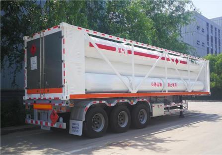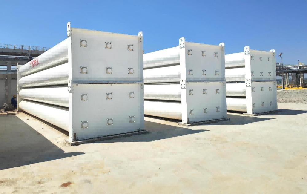 Este é um contêiner tubular de hidrogênio de 26 m³ equipado com 7 cilindros de aço de grande capacidade. Possui uma pressão nominal de trabalho de 20 MPa e uma capacidade máxima de carregamento de hidrogênio de 413 kg, projetado para armazenamento e transporte de hidrogênio de forma segura e eficiente.
